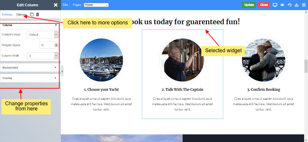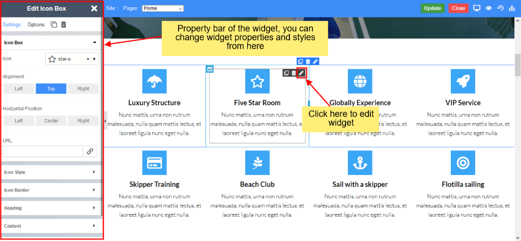 When the item is dropped on a particular position, to edit you will be able to see properties bar, Advance Option to Customize, etc. for different types of Widgets.