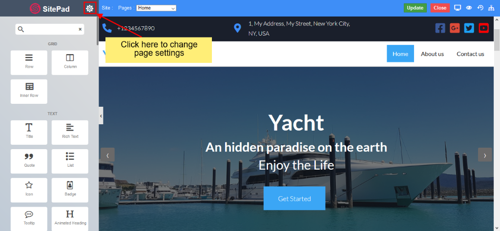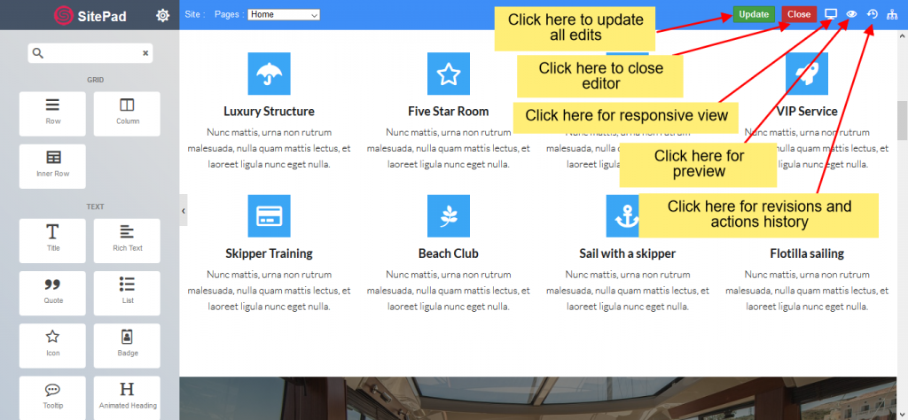 After redirecting, you will see the Home page of your website in the edit mode of SitePad Editor. Now you can start editing your website Home page, and also you can close the SitePad Editor using the close button. After clicking the close button, you will redirect to the SitePad Dashboard.