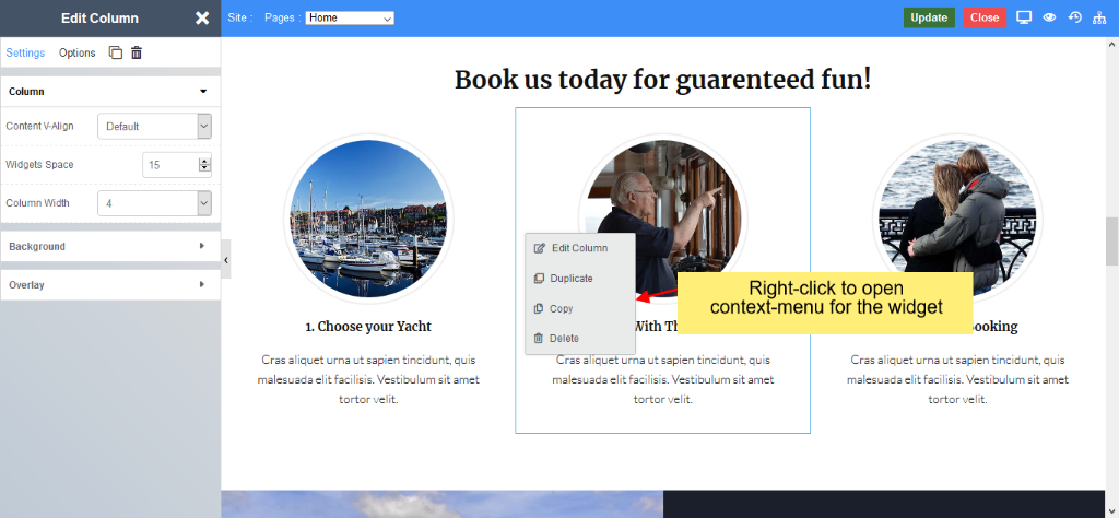 Right-click on the widget to see more options like edit, duplicate, copy, delete, etc.