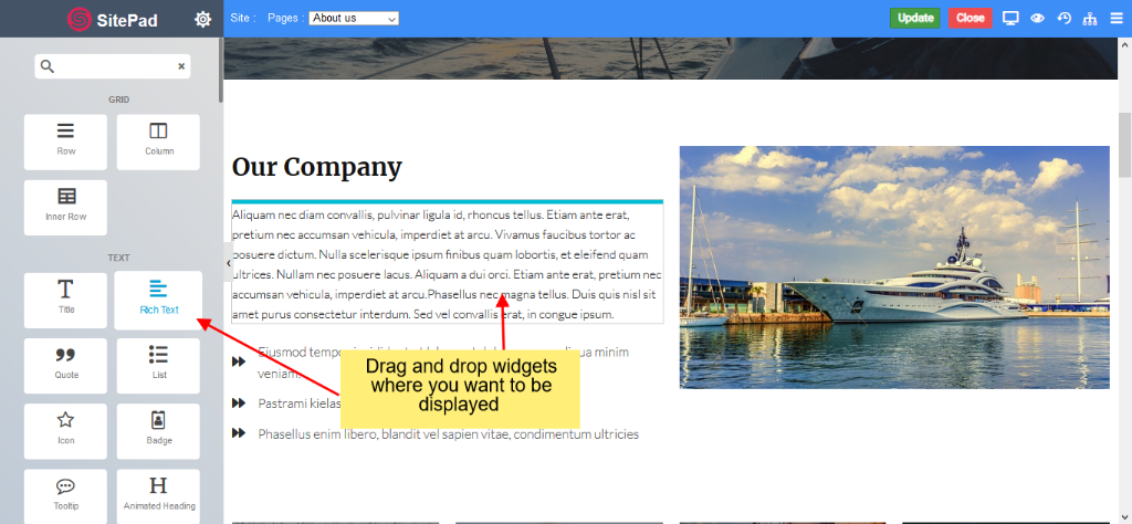 You can also drag and drop different Widgets where ever you want to see the elements. There are many different Widgets like Title, Paragraph, Slider, Service Box, Rich Text, Images, Videos, etc.