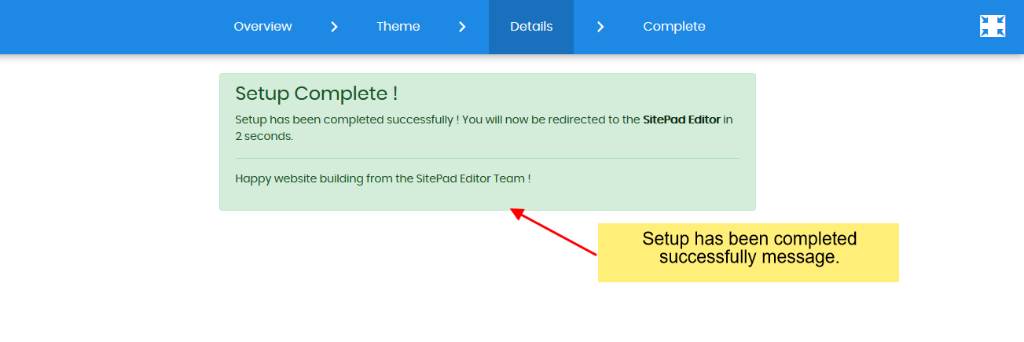 Finally, you have successfully set up the site, This is the last level of the entire setup process. Once you hit this level, you will be automatically redirected to the "Sitepad Editor" within 5 seconds.